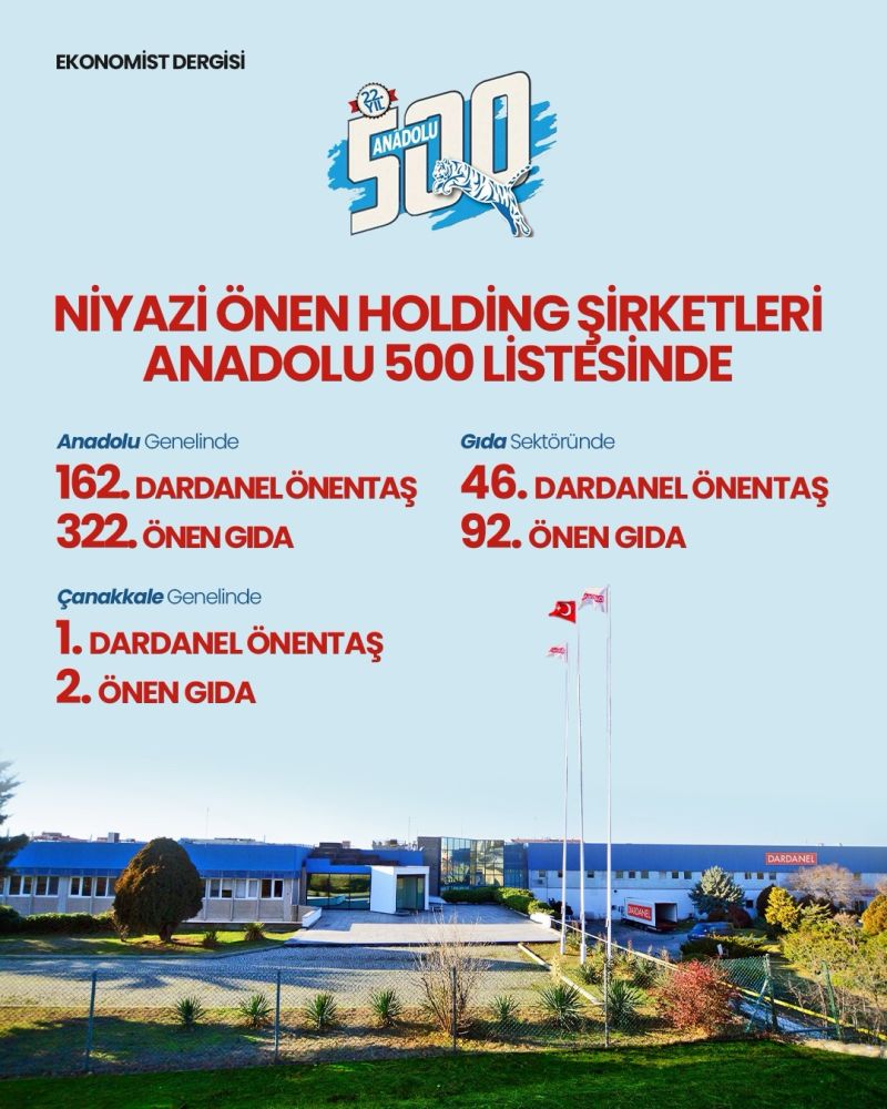 Ekonomist Dergisi’nin hazırladığı “Anadolu’nun En Büyük 500 Şirketi” araştırmasında Dardanel Önentaş Gıda Sanayi A.Ş. ve Önen Gıda Sanayi A.Ş. listeye girerek önemli bir başarıya imza attı. Çanakkale’den sıralamaya dahil olan şirketler içinde ilk iki basamağı paylaşan Dardanel ve Önen Gıda, bölgesel liderliklerini ulusal arenaya da taşımış oldu.