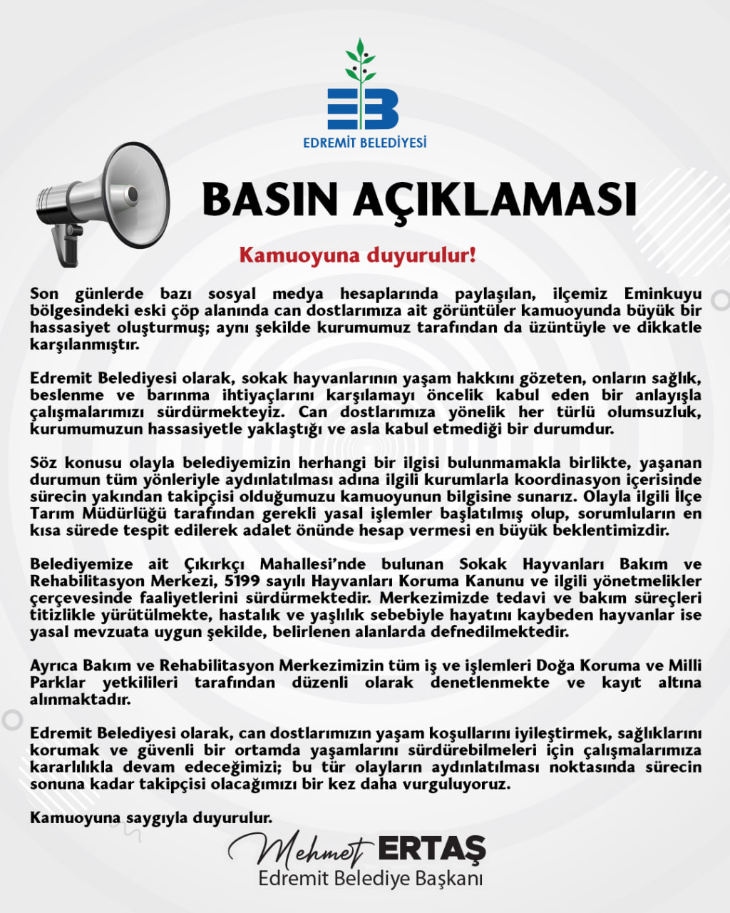 “Edremit Belediyesi olarak, sokak hayvanlarının yaşam hakkını gözeten, onların sağlık, beslenme ve barınma ihtiyaçlarını karşılamayı öncelik kabul eden bir anlayışla çalışmalarımızı sürdürmekteyiz. Can dostlarımıza yönelik her türlü olumsuzluk, kurumumuzun hassasiyetle yaklaştığı ve asla kabul etmediği bir durumdur.”