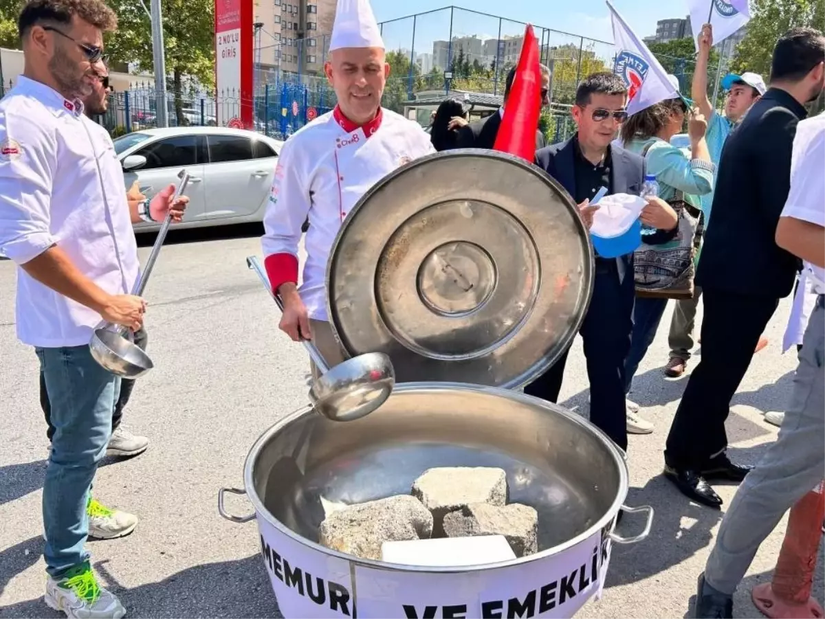 Eylemde konfederasyon üyeleri, yanlarında getirdikleri balon ve yemek kazanlarıyla yapılan teklife karşı protesto gerçekleştirdi.