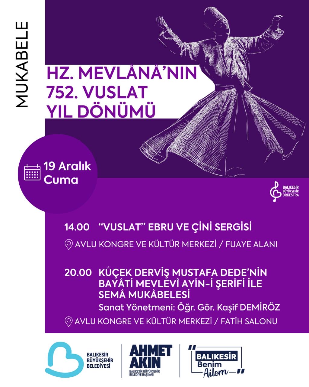 Balıkesir Büyükşehir Belediyesi tarafından Hz. Mevlana’nın 752. Vuslat yıl dönümü nedeniyle 19 Aralık Cuma günü “Vuslat” Ebru ve Çini Sergisi ile “Derviş Mustafa Dede’nin Bayâti Mevlevî Ayin-i Şerîf’i ile Semâ Mukabelesi” etkinlikleri gerçekleştirilecek.